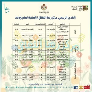 يعلن مركز زها الثقافي العقبة و بدعم من مجلس محافظة العقبة و بالتعاون مع سلطة منطقة العقبة الاقتصادية عن طرح مجموعة من البرامج التدريبية وفق الفئات العمرية و المواعيد المحددة في الاعلان